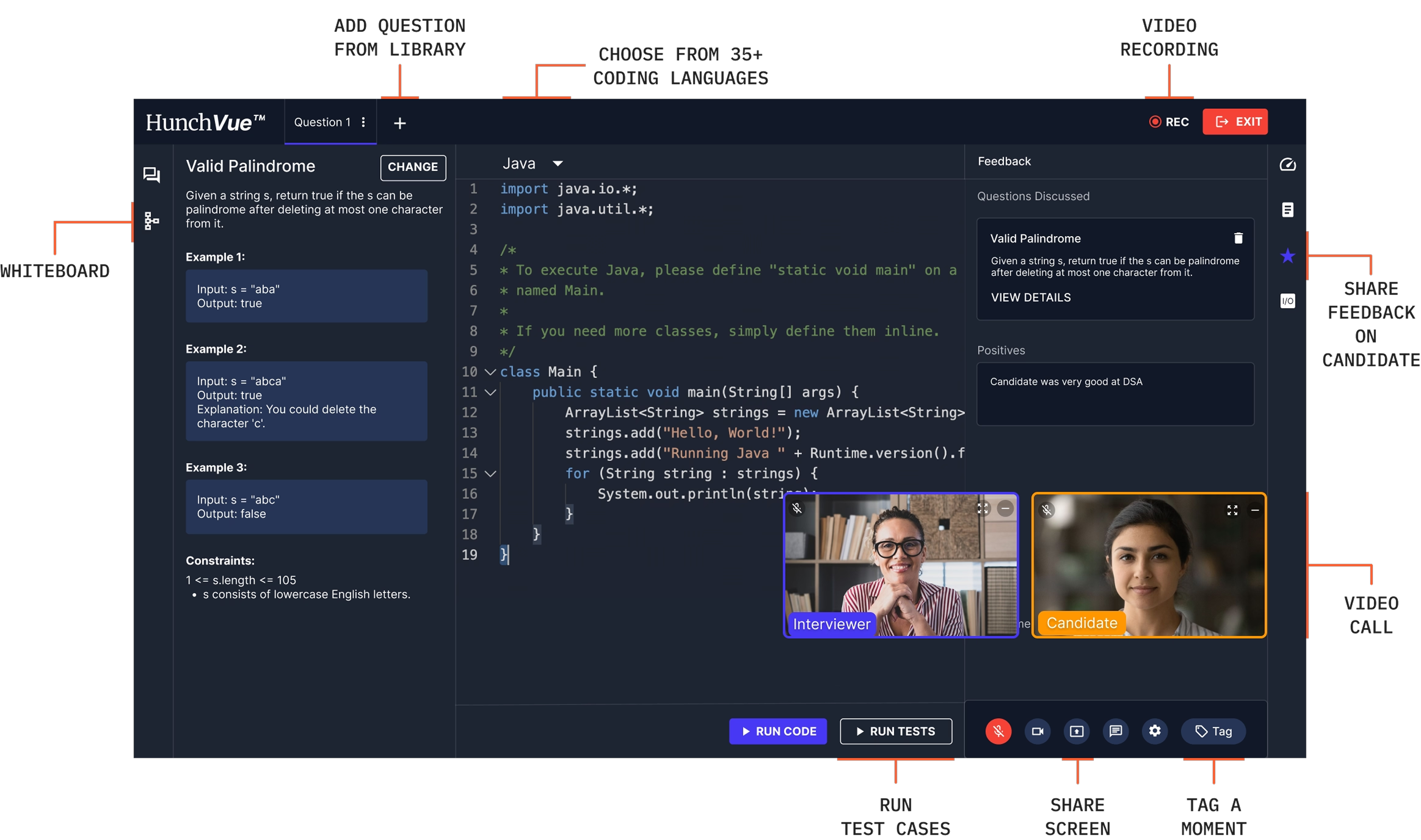 Your hiring manager wants to see how the candidate debugged that algorithm. HunchVue lets you jump directly to that 90-second moment with smart tags and separate video-code playback tracks. No upgrade required. No extra charge per seat.