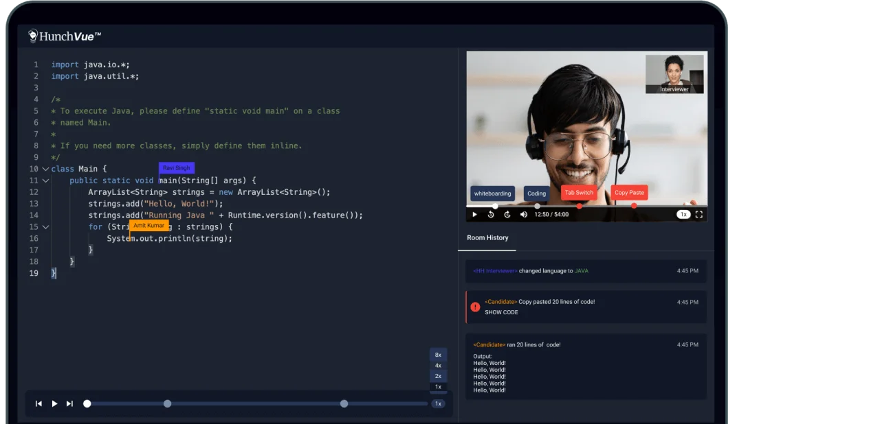 HunchVue™ supports live coding in 35+ programming languages including Python, Java, JavaScript, TypeScript, Go, Ruby, C++, Rust, Swift, Kotlin, and more. For interview formats, it handles all major technical rounds: coding challenges, system design (via collaborative whiteboard), debugging exercises, pair programming sessions, and general technical discussions - all within a single platform. The interviewer can switch between the code editor and whiteboard at any point during the session without disrupting the candidate.